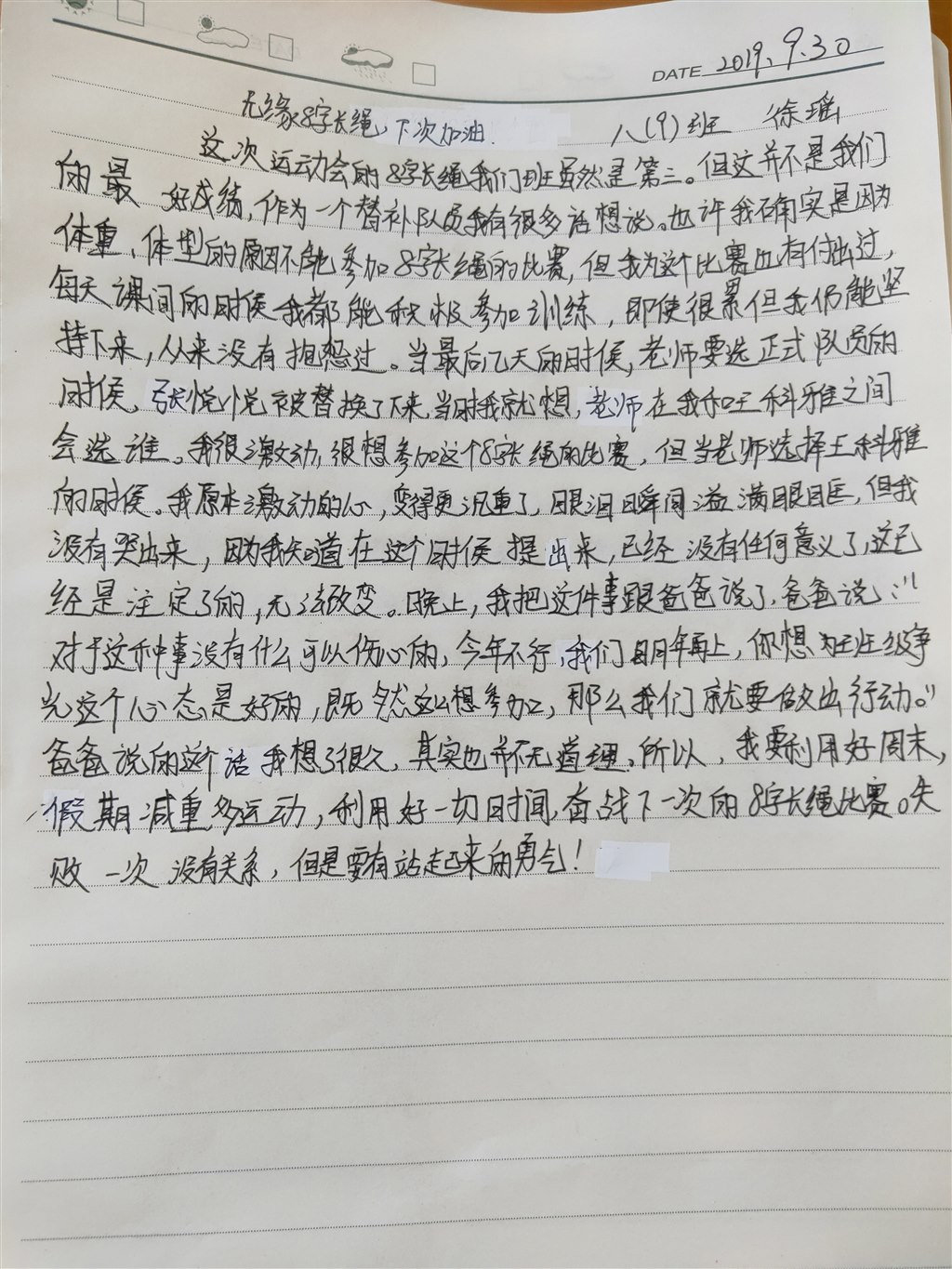 一年一度的运动会如约而至。八9班学生们在兴奋和期盼中度过了美好的一天。当然,在前期有很多的准备。他们享受了运动过程,收获了成长。 总体来说,9班孩子的表现非常好。他们挖掘了自身的潜能。班主任也努力创造机会让更多的孩子参与到整个活动中。包括赛前的准备。一直是有很多的预备队员一起参训。为的是扩展基础与涉及面,通过这样的一个活动,带动整个班级的体育再向上走一个台阶。 运动着总是美丽的,班主任支持孩子们运动,希望孩子们能享受运动,美好的人生不能离开运动。正如毛泽东所说:野蛮其体魄,文明其精神。这是非常有道理的。 这次从报名开始,就努力发动。在听取广泛意见的基础上,让尽可能多的同学报名,希望运动会不只是几个高手的舞台。虽然全是高手参加必定总分更高,但是给不同的孩子机会,比比分更值得。 最后9班获得团体总分学校及年级第二的好成绩,团体项目三次走上领奖台,创造了属于他们的奇迹! 期待来年继续创造新的奇迹!
